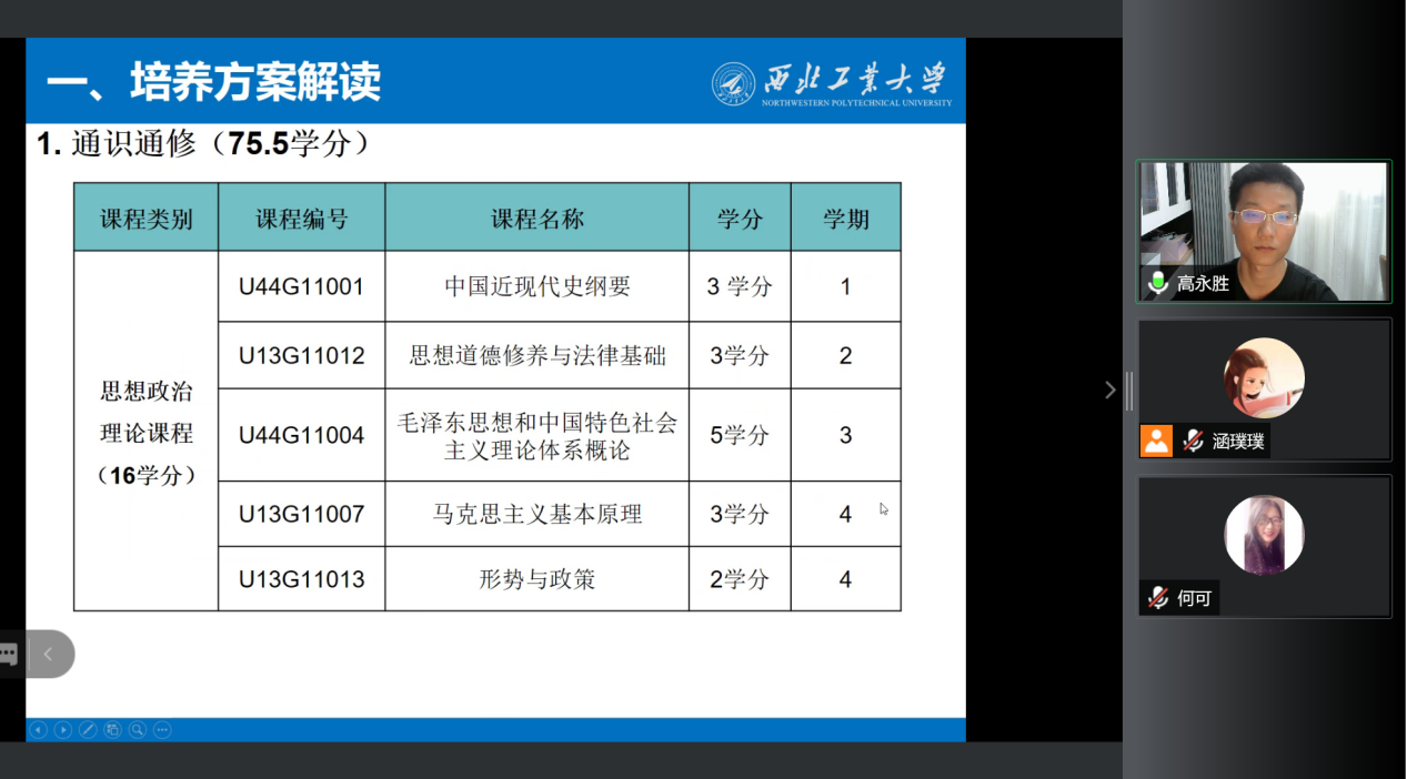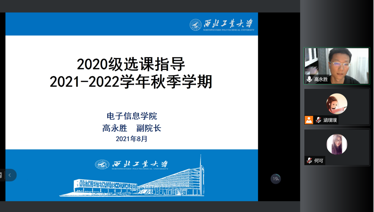 会议开始,高永胜副经理从各年级的培养方案出发,为同学们解读培养方案中通识通修、学科专业、专业方向等模块的课程组成,又为同学们讲解2021-2022年秋季学期选课流程、选课技巧以及如何合理安排课程,提醒同学们提前做好课程规划,使同学们对电子信息类的培养方案、选课方法及学习进程有了完整的了解。