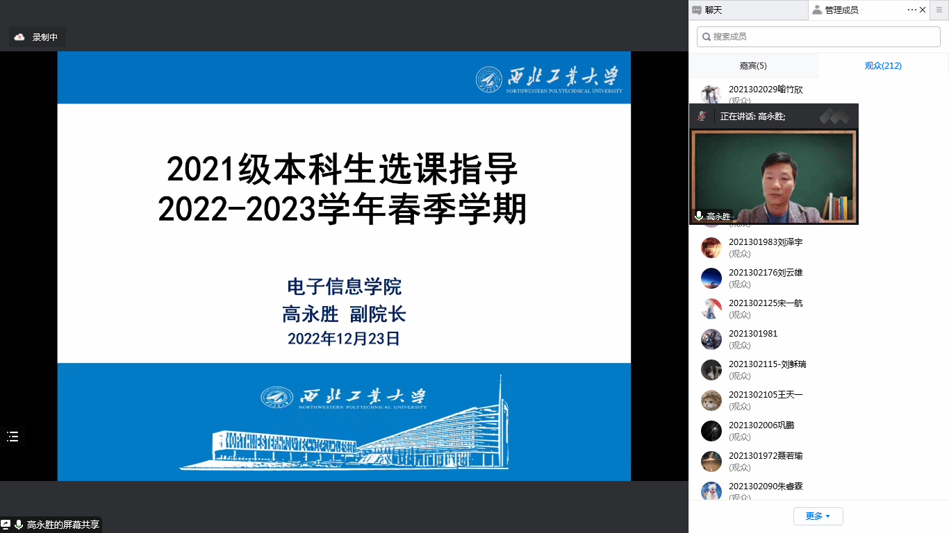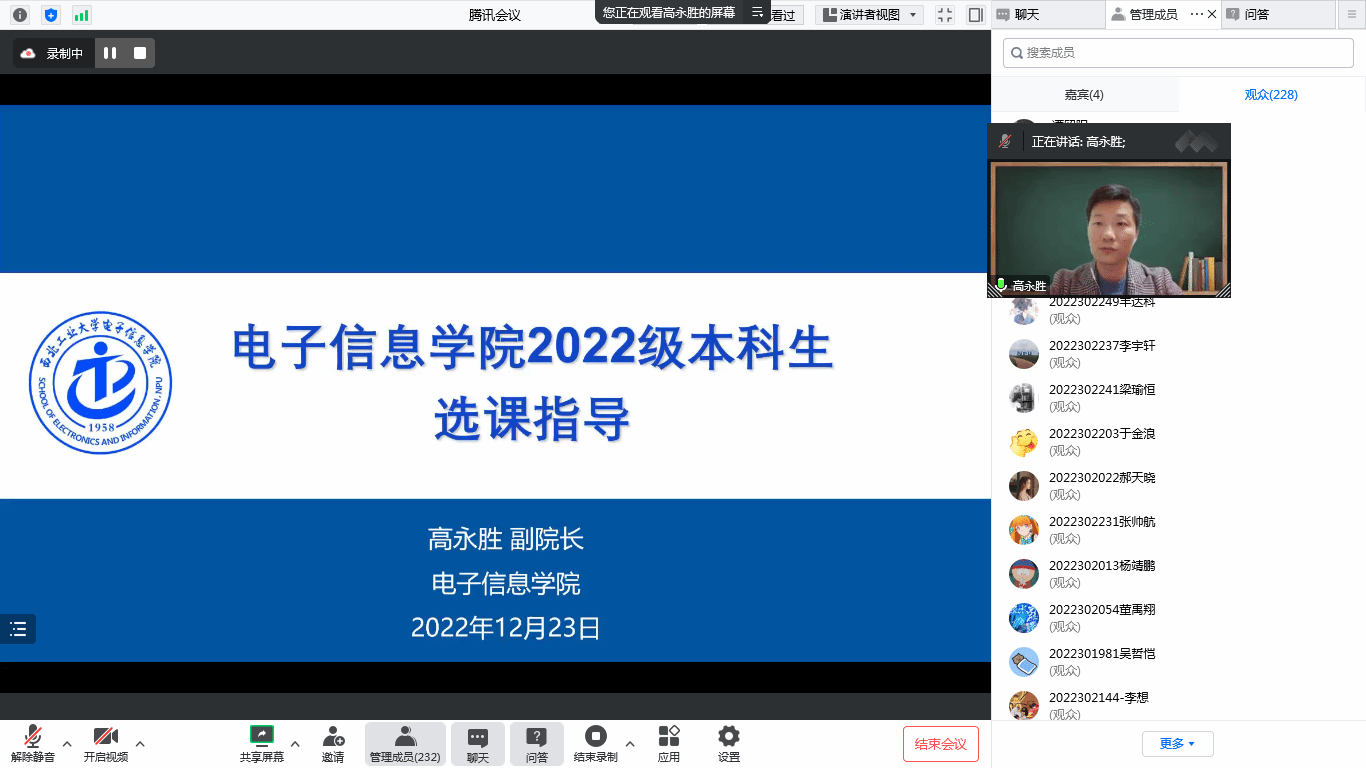 高永胜结合电子信息类专业的总体情况,为各年级员工详细解读了培养方案中各模块的学分要求、课程体系设置,并给出了2022-2023学年春季学期选课建议。高永胜指出,公司一直以来持续推进一流专业和一流课程建设,着力打造一流教学资源,希望同学们可以充分利用公司和公司的资源和平台,结合自身个性化发展需求,做好学业规划,学有所成。最后他嘱咐同学们特殊时期要加强自我防护,注意身体健康,劳逸结合,安排好个人学习和生活,有问题和困难多与辅导员和班主任沟通联系。
