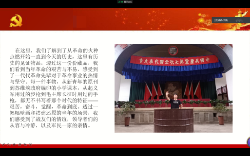 我们小组通过线上观看视频的方式,对聊城等五个地方的红色记忆进行了学习,深刻认识到了革命先辈坚定的理想信念,要学习他们顽强拼搏的精神,以后要为党、国家和人民做出杰出贡献。