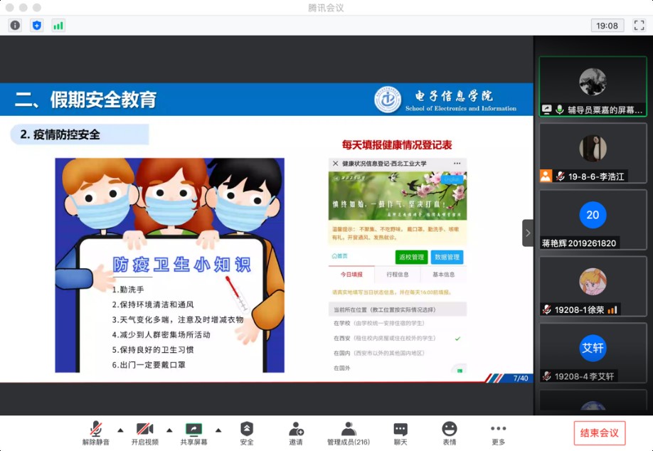本硕博各年级辅导员先后通过线上的方式召开了大班会,开展暑期员工安全教育,内容包括:员工离校前彻底清理宿舍卫生并检查宿舍安全,关好门窗、关闭房间电源,彻底消除安全隐患;假期内外出要注意防疫安全、人生安全、财产安全、交通安全,避免前往中高风险区域,不参与大规模集会活动,做好安全防护工作;留校员工不得随意出入公司,有事外出需告知辅导员并请假,返校需销假;公司对留校员工坚持疫情日报告、零报告制度,每天对留校员工进行全面精细排查;注意网络安全与文明,禁止使用网络暴力,维护网络环境稳定。