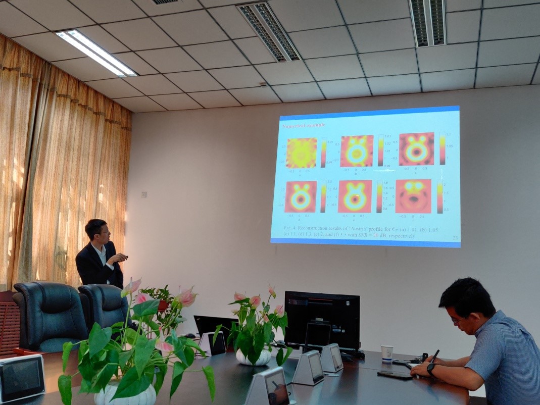 报告会前,李长侑老师简要介绍了陈教授的研究领域及近年来取得的学术成果,大家对陈教授表示热烈欢迎。陈教授在报告中,介绍了多重散射现象对电磁反演成像的直接影响。首先,陈教授强调了成像方法的空间分辨率的定义,介绍了仪器成像和计算成像两种不同的成像方法,以及在存在多重散射效应并且不能忽视的实验条件下,包含多重散射效应的全波非线性反演方法与多重散射效应在玻恩近似条件下反演成像方法之间的比较。