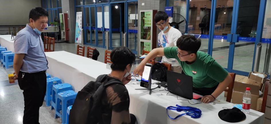 新生们首先来到内场注册点处,通过人脸识别与身份信息以及录取信息核对进行报到。同时,领取一卡通、选课手册等物品及口罩和手套等防疫物资。