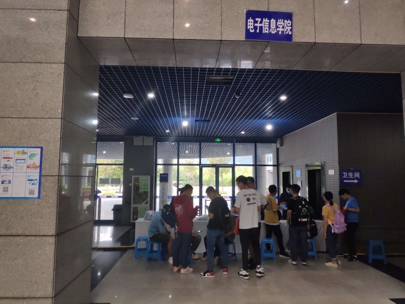 新生首先来到内场注册地点处,通过人脸识别与身份信息以及录取信息核对进行报到。同时领取一卡通、选课手册等物品以及口罩和手套等防疫物资。