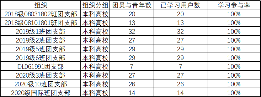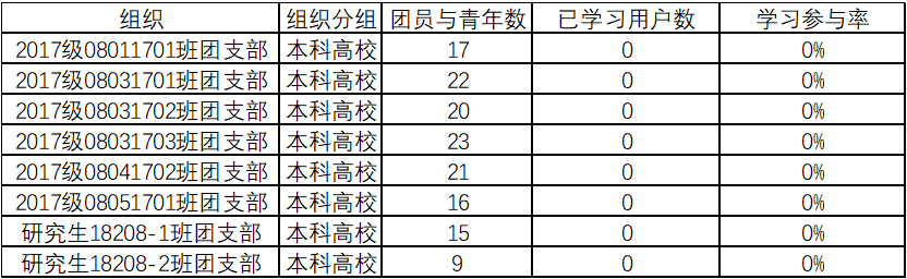 然而,17级、研究生级仍有很多班级完成率低于50%,希望这些班级在之后的学习中能够提高学习积极性,向完成度较高的团支部汲取经验,按时完成学习任务。