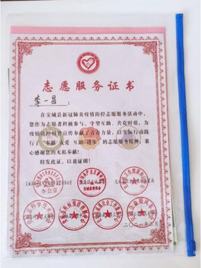 新年伊始,疫情在东北三省、河北等地发生了部分反弹。李一昌的家乡——山西省,在秋冬疫情高发期间受到了一定影响。寒假期间,他按规定在返乡观察数日无不良反应后,积极响应当地返乡老员工临时团支部的号召,成为了一名青年抗疫储备志愿者,主要参加新媒体运营组织,协助拍摄宣传视频,采访一线工作人员,获取第一手的新闻素材,为疫情防控工作奉献自己的一份力量。