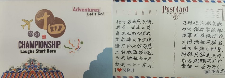 活动开始之后,全校师生广泛参与,积极报名,提交了多份精美的明信片作品。他们在空白之处,将十四运会徽与吉祥物重新架构,结合时代精神与地域特色,创作出丰富多彩的图案,惟妙惟肖。明信片背面,参赛同学或咏诗,或写信,节奏丰富,情真意切,体现出浓浓的爱国之情,展现出昂扬进取的青年风貌。