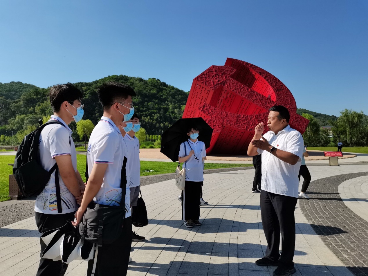 实践队员到达南泥湾后,映入眼帘的就是南泥湾的标志性建筑——党徽广场。在庄严的党徽雕塑前,南泥湾集团退休职工党支部的马杰书记热情地接待了实践队员,并为他们讲述了一堂生动的党课。