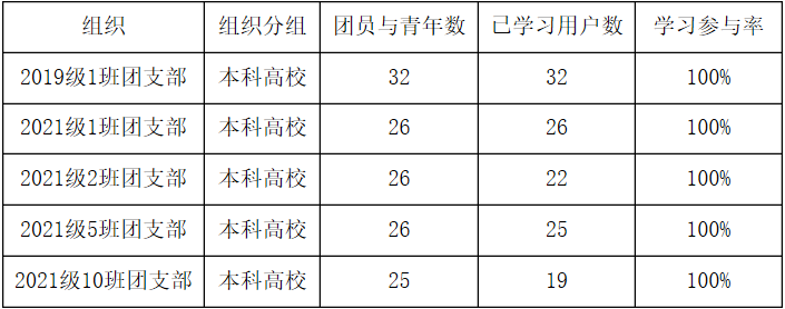 在本期学习中,本科支部20级、21级学习参与率较高,并有5个班级完成率达到了100%,它们分别是2019级1班团支部、2021级1班团支部、2021级2班团支部、2021级5班团支部、2021级10班团支部,望继续发扬!希望所有团支部在青年大学习过程中向他们看齐,不断进步,越来越好!