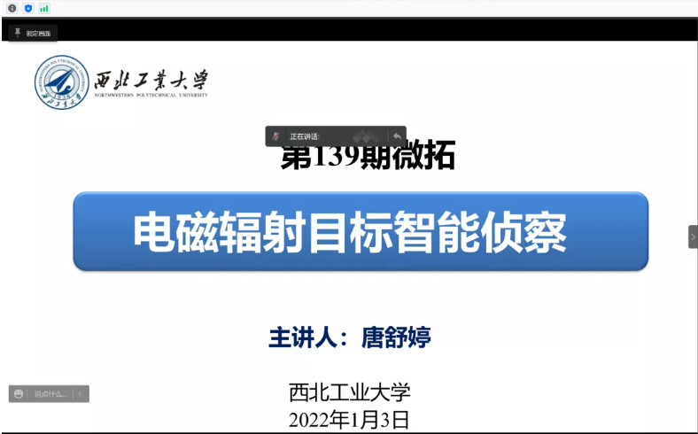 12月29日晚,由公司党委学工部主办,点点taptap承办的“微拓”-WE TALK学术沙龙第139期在线上举行。本次活动主题是《电磁辐射目标智能侦察》,主讲人为点点taptap2020级研究生唐舒婷。活动伊始,主讲人向大家介绍了利用电磁辐射特征刻画目标特性的研究现状,阐述了传统电子侦察面临的挑战,并指出如何利用智能化手段实现自适应、可解释、灵活地处理目标电磁信号已成为电磁辐射目标智能侦察的关键核心。随后,围绕电磁辐射目标智能侦察中的处理流程,主讲人向大家介绍了高效率信号分选和高准确率电磁辨识两个核心技术。最后,随着主讲人分享自己研究生期间的科研心得与体会,本次微拓活动圆满结束。