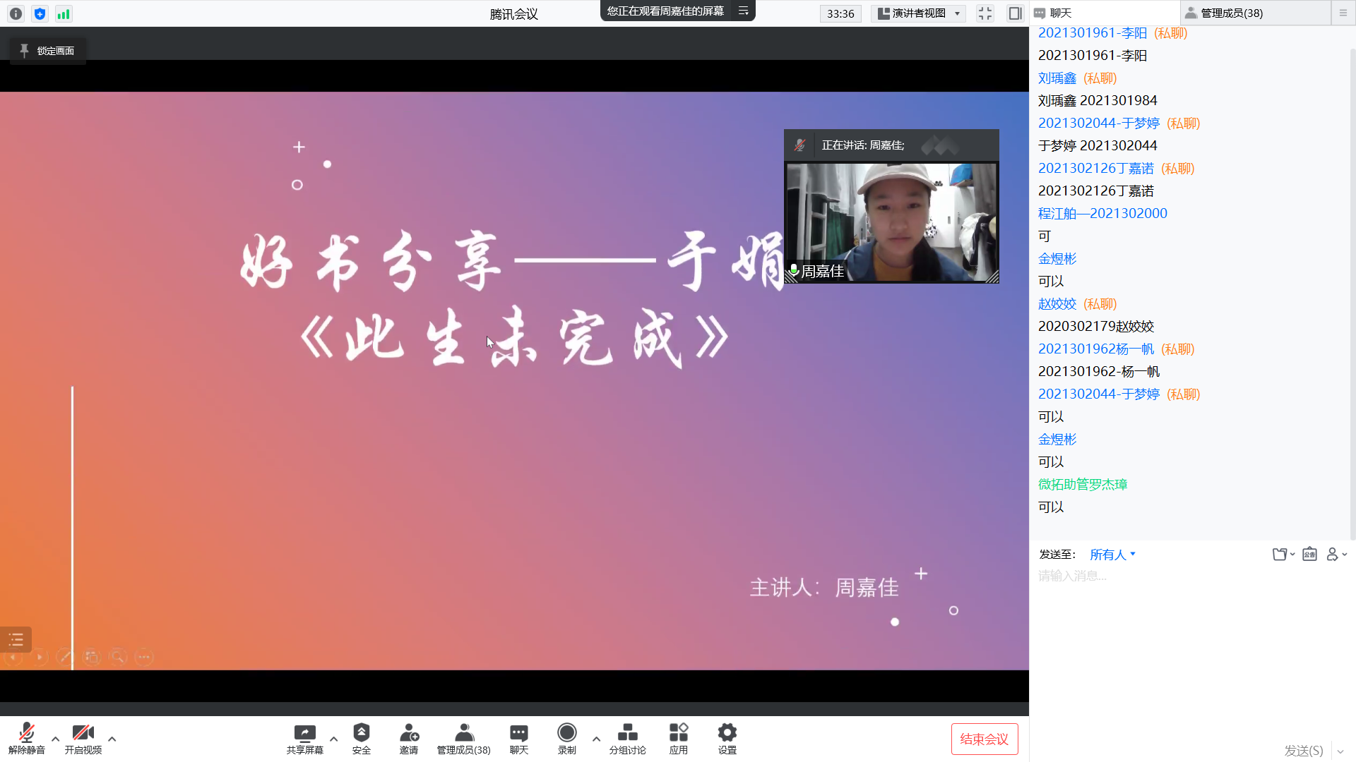 4月15日晚上,由公司党委学工部主办,点点taptap承办的“微拓”-WE TALK学术沙龙第150期通过线上会议的形式举行。本次活动主题为“好书分享—于娟《此生未完成》”,主讲人周嘉佳是点点taptap2020级本科生,曾获国家励志奖学金、校二等奖学金以及社会服务先进个人、学业先进个人、“优秀共青团员”等荣誉表彰。