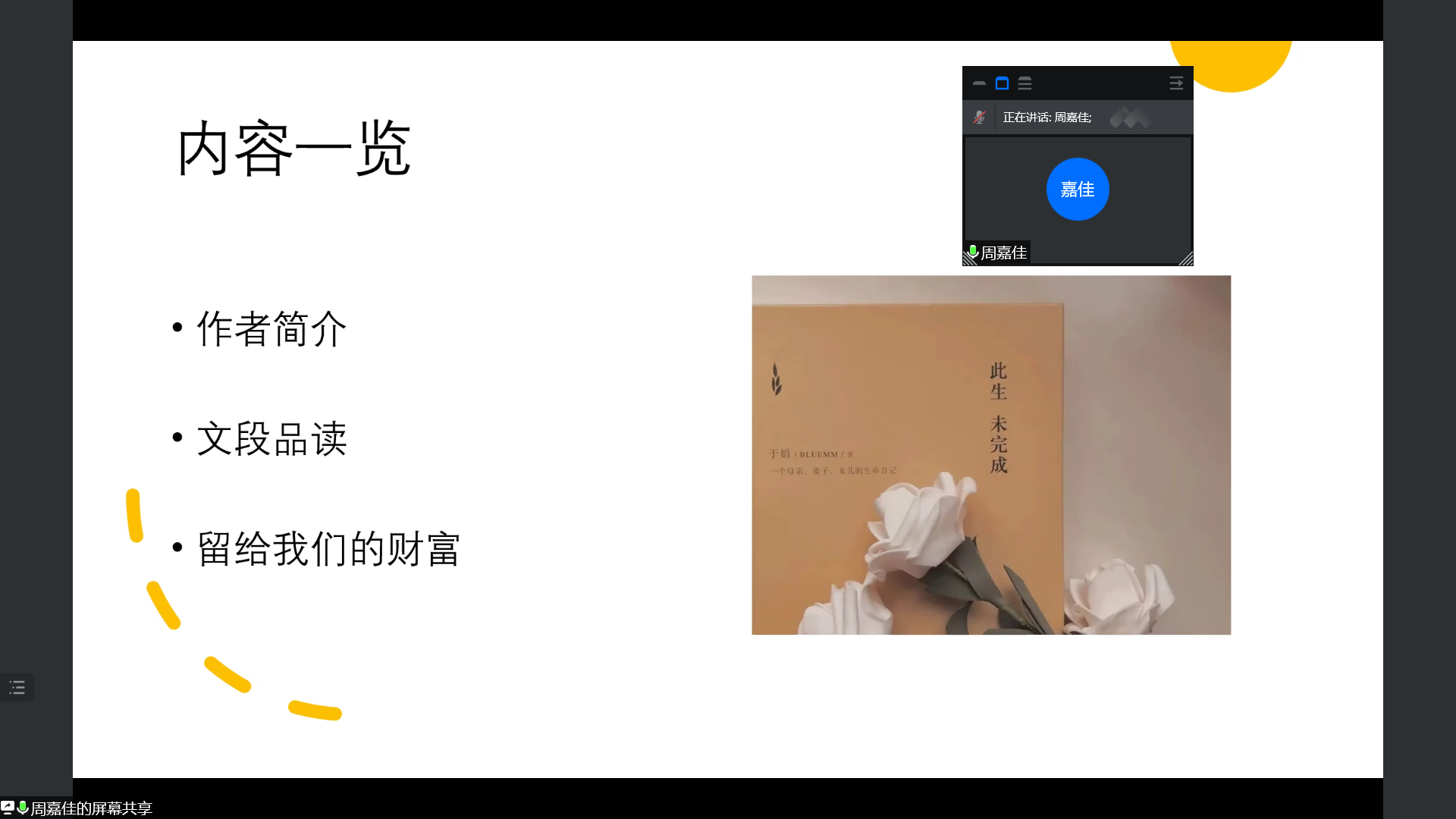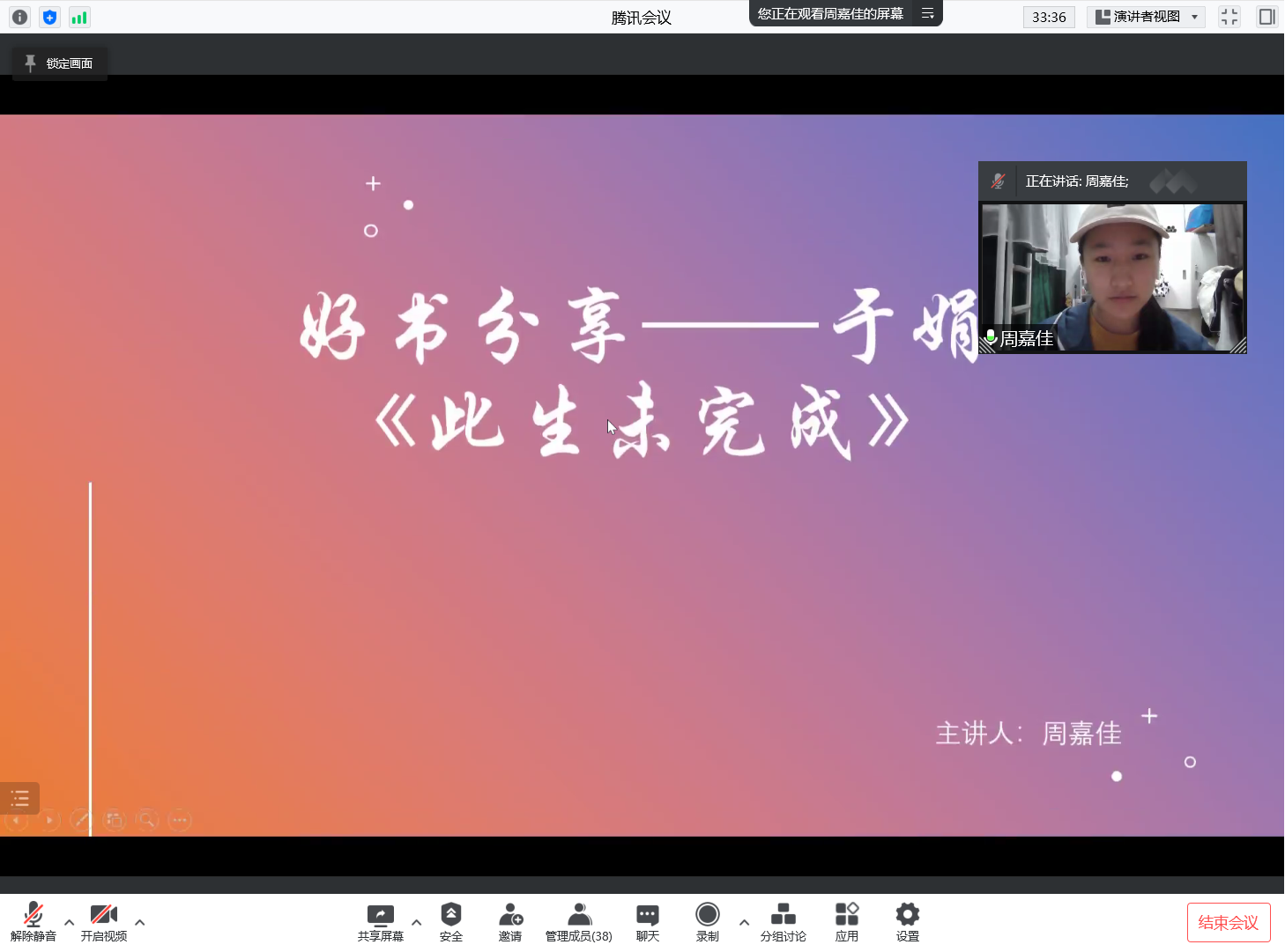 4月15日晚上,由公司党委学工部主办,点点taptap承办的“微拓”-WE TALK学术沙龙第150期通过线上会议的形式举行。本次活动主题为“好书分享—于娟《此生未完成》”,主讲人周嘉佳是点点taptap2020级本科生,曾获国家励志奖学金、校二等奖学金以及社会服务先进个人、学业先进个人、“优秀共青团员”等荣誉表彰。