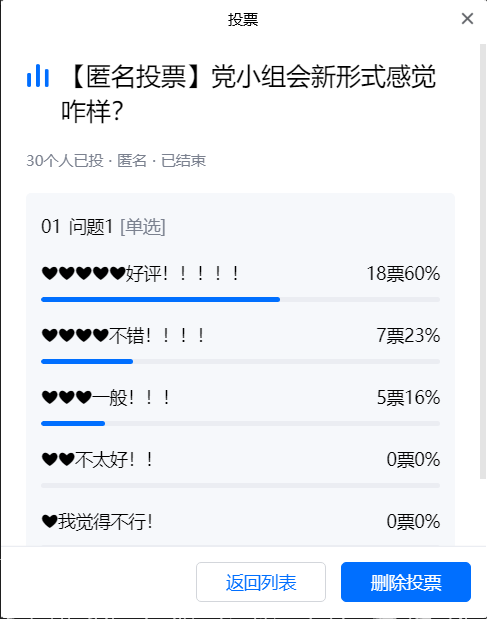 在本次党小组会结束后,支委进行了一次匿名投票,以统计支部党员对这次试验性党小组会的评价,并获得了良好的评价。“本次党小组会提出的方法丰富了我们党史学习教育的形式,极大地调动了广大党员干部的学习积极性,也让我们更有参与感,希望以后能继续坚持这种方法。”一名与会党员在会后激动的说到。