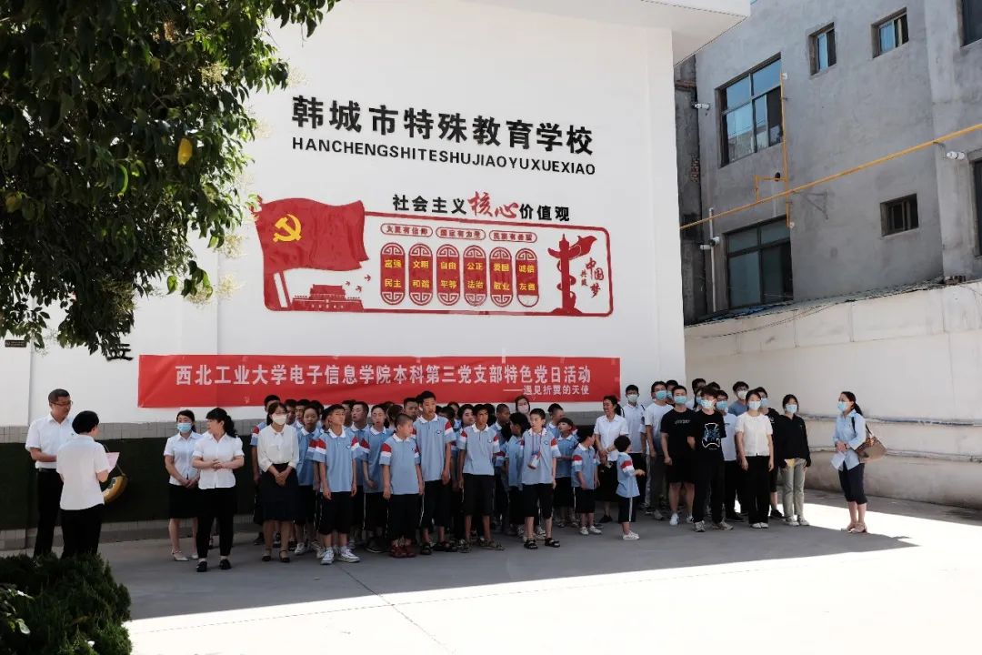 (韩城市特殊教育公司的孩子们欢迎支部党员们的到来)