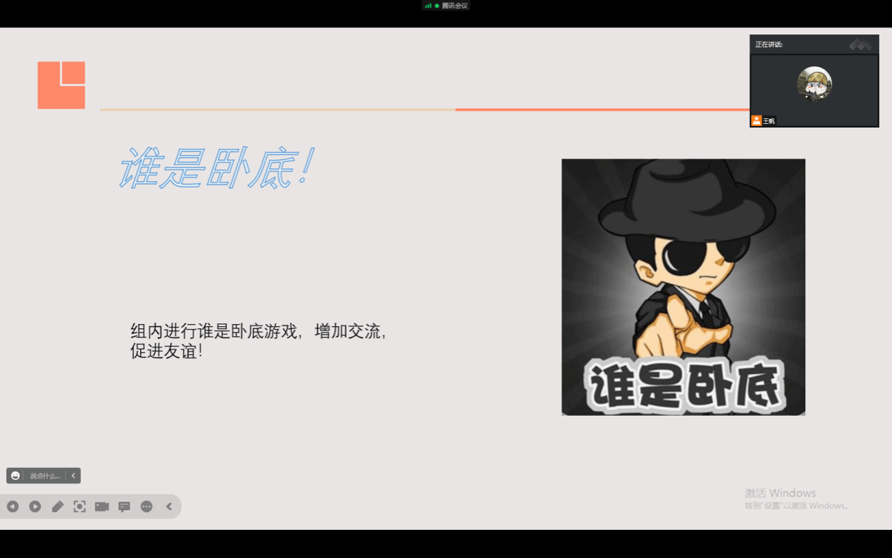 第三个游戏是“谁是卧底”。小组内进行游戏,每轮中有一位同学拿到不同于其他同学的关键词,每个同学需要描述自己的关键词,每次描述结束后所有同学选出他们认为拿到不同关键词的卧底,投票最高者淘汰,直到游戏结束。