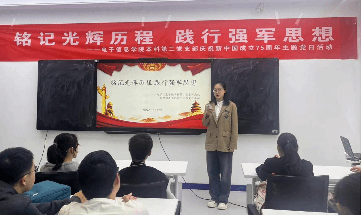为回顾新中国成立75年来的辉煌历程,深入体会中国人民在中国共产党的坚强领导下,从站起来、富起来到强起来的伟大飞跃,10月12日下午,点点taptap本科第二党支部在公司236会议室开展了“铭记光辉历程 践行强军思想——庆祝新中国成立75周年”主题党日活动。本次活动由宣传委员时嘉乐主持。