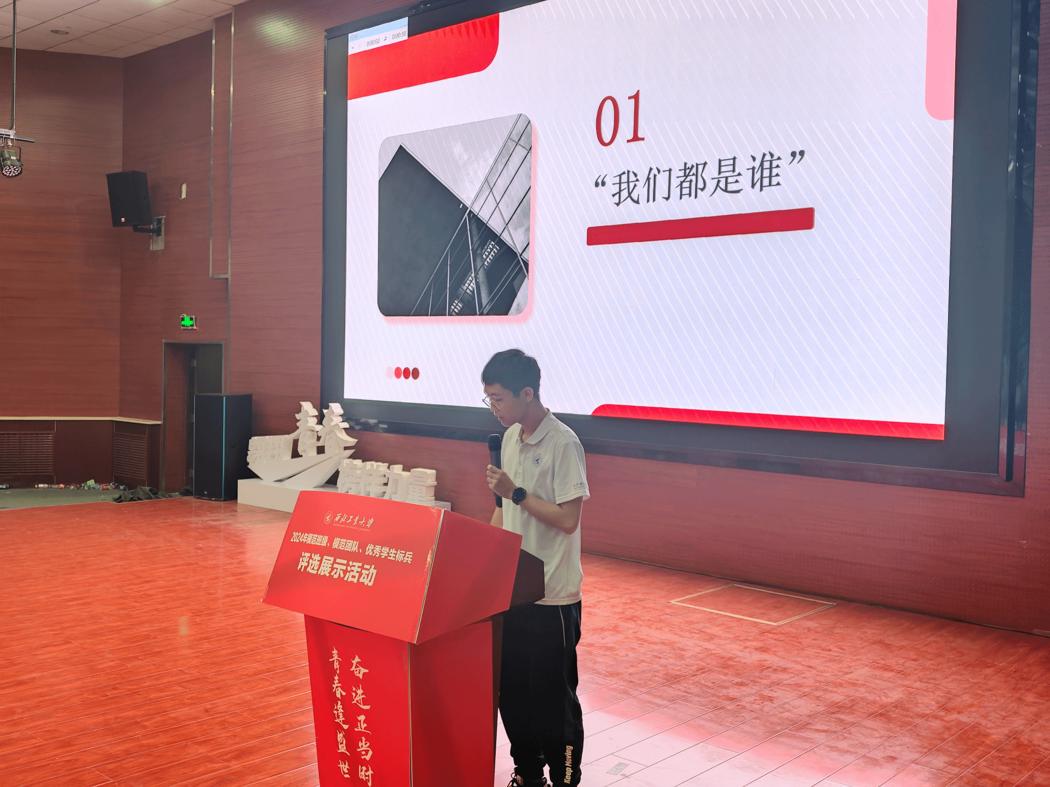 第二部分为班级建设汇报,各班代表通过PPT、视频等形式展示入学近两个月以来班级文化及学风班风的建设成果,介绍解读各具特色的班徽、班旗、班服设计,共同制定的班训、班规、班级口号。各班通过院所研学、集体自习、晨读打卡等多种形式打造优良学风,营造浓厚学习氛围。