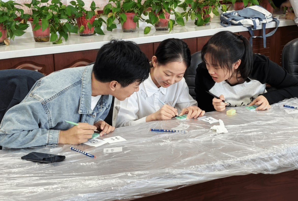 随后,由公司员工雕刻协会负责人王皓然讲授橡皮章雕刻技巧。王皓然同学从制作实践出发,深入浅出地讲解了雕刻的基本原理、执刀手法、雕刻技巧等内容,并以“中”字为例为同学们演示雕刻过程,并鼓励大家要科学操作,也要敢于实践。随后,同学们按照讲解内容进行练习体验,利用橡皮章刻制了“共筑华章”“盛世中华”“国泰民安”“天下工大”“世界三航”等内容。