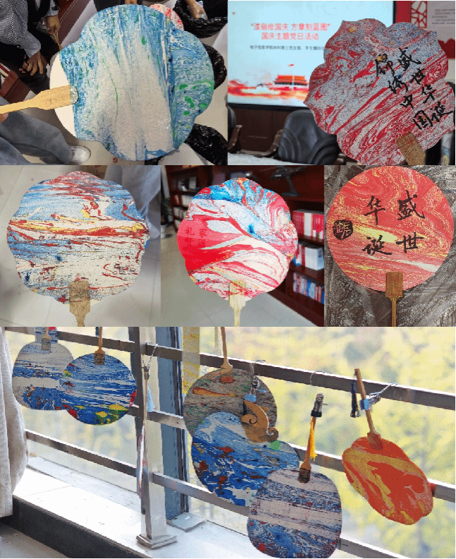 雕刻体验活动结束后,大家开始了漆扇体验活动。大家按照自己的构思将不同颜色的漂漆混合在水中,有的以红色和黄色为主题色,构筑国泰民安、欣欣向荣的盛世画卷,表达对祖国繁荣、人民幸福的美好祝愿;有的则以蓝色为扇面主题色,紧扣公司“三航”特色,寄予科技水平不断进步、校园事业蓬勃发展的寓意。漆扇制作完成后,大家在扇面上写上祝福语并盖上亲手雕刻的印章,为本次活动圆满收官。