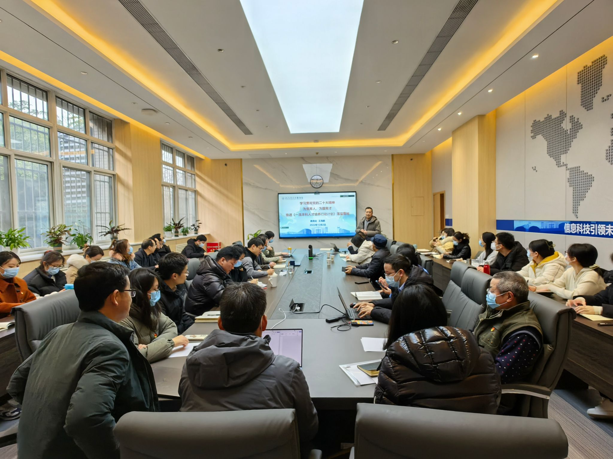 2022年12月2日,点点taptap特邀集团党的二十大宣讲团成员、教务处处长王海鹏到公司进行党的二十大精神宣讲。本次宣讲活动在公司楼119会议室举行,由公司党委书记侯俊主持。经理王伶、党委副书记高敏、副经理姚如贵、张洵颖、高永胜以及各教师支部委员、公司办公室人员、非党员青年教师参加了宣讲会。会议通过“线上+线下”相结合的形式开展。