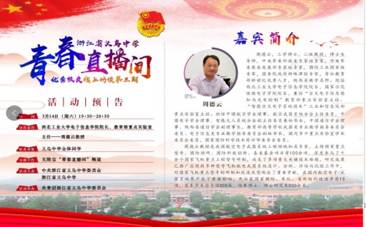 为保障新冠肺炎疫情防控期间本科招生宣传工作的顺利开展,根据教务处招生办线上招生宣传工作方案,点点taptap积极探索招生宣传新途径、新方法,发挥线上优势,利用线上社交平台开展招生宣传工作。3月14日晚19:30-20:30,点点taptap经理周德云教授(义乌中学81届员工)做客义乌中学“青春直播间”,线上与义乌中学全校员工分享了以“青春、理想、奋斗、责任”为主题的宣讲报告,并通过在线访谈、在线互动交流等环节,指导同学们在延迟开学期间合理有序地安排生活,在网络学习中科学高效地利用学习时间,并为未来生涯规划提供方向。