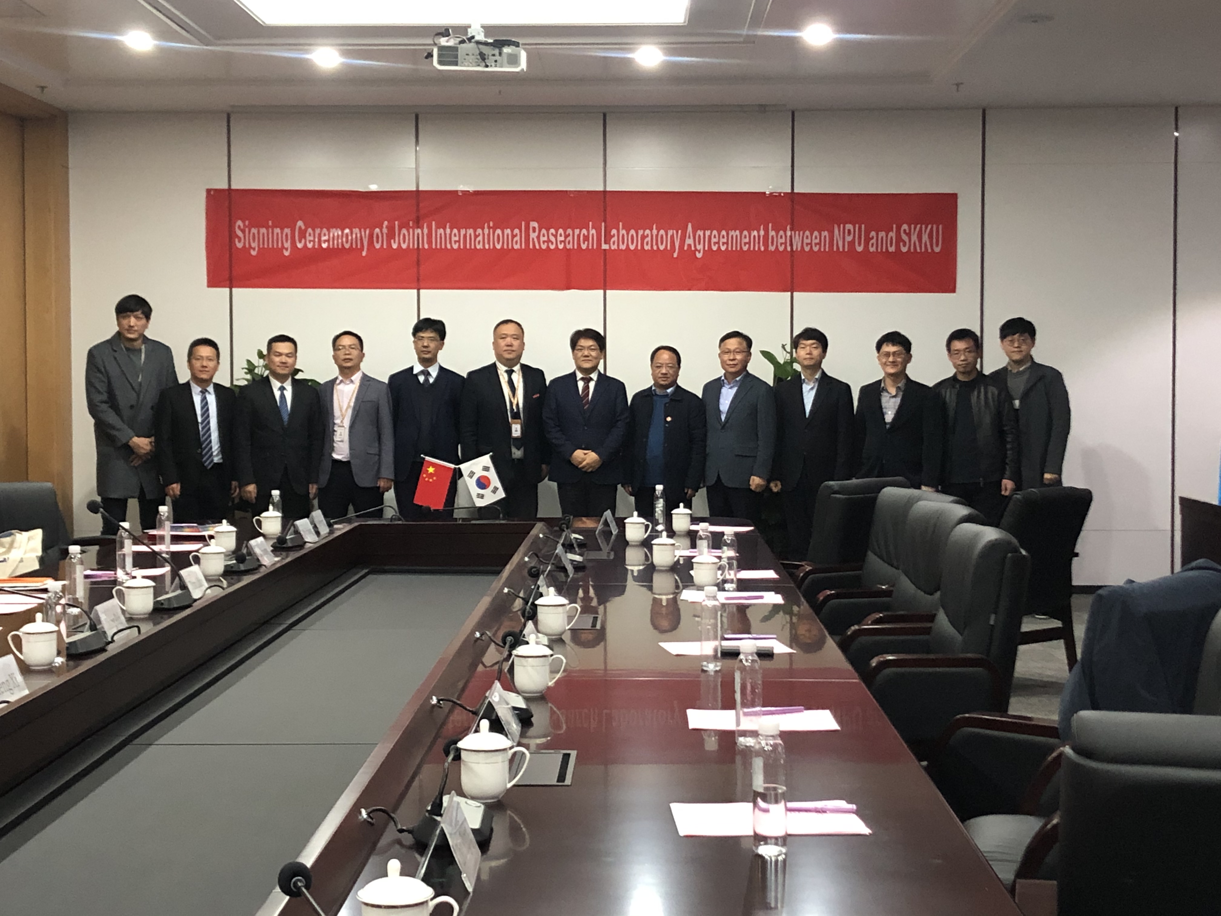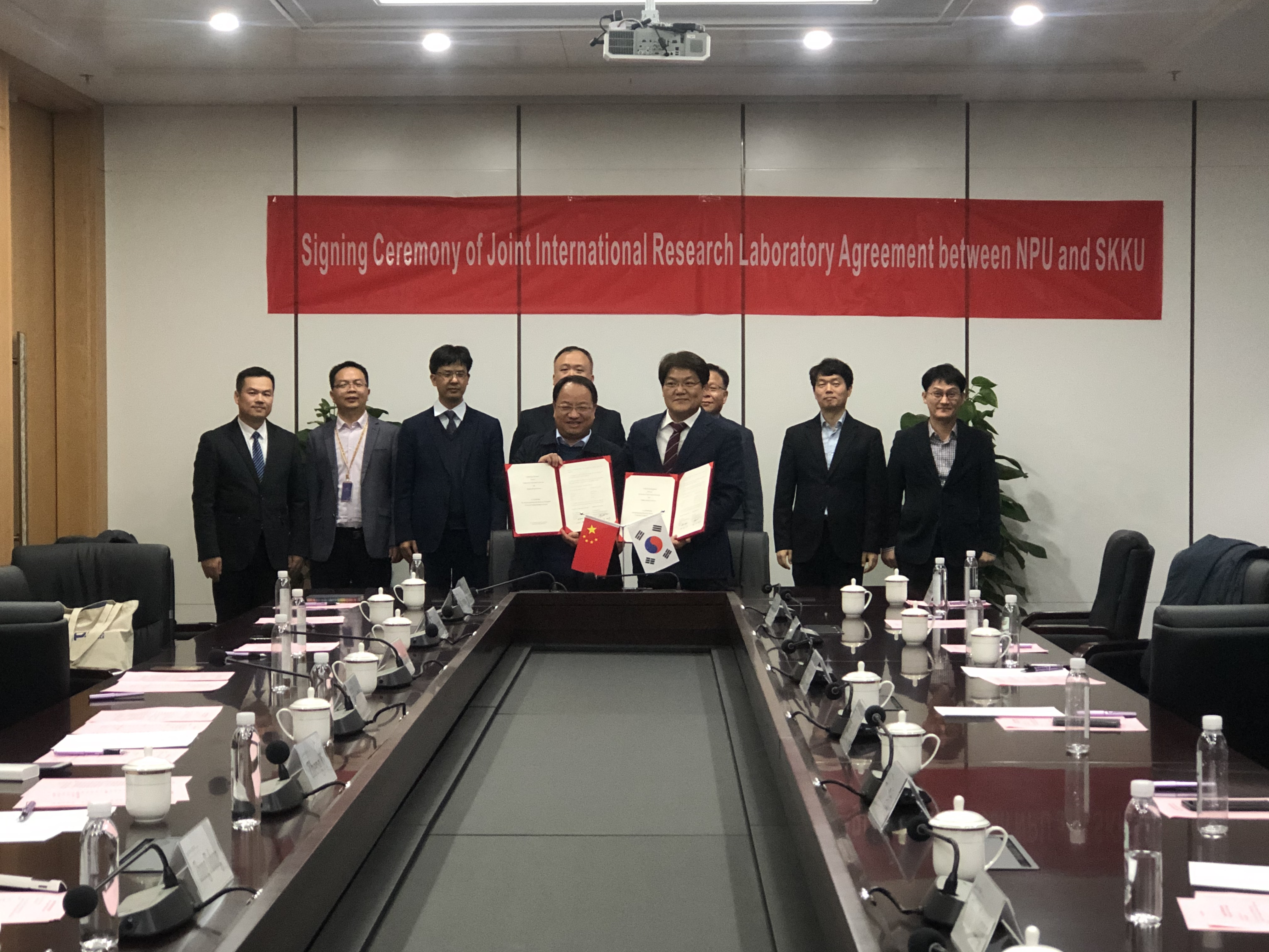 随后,访问团就太仓校区、长三角研究院建设发展情况,建立西工大-成均馆大学联合研究实验室进行座谈交流。郑曦常务副经理代表长三角研究院与太仓校区管理委员会热烈欢迎访问团一行的来访;长三角研究院张铁邦副经理介绍了长三角研究院情况;周德云经理简要介绍了公司和成均馆大学关于合作办学的进展和筹备情况,并介绍了国际联合研究实验室的科研方向和目标;张富利处长表示大力支持公司和成均馆大学的合作办学,并提出了明确要求;郑曦常务副经理作了总结发言,代表太仓校区管委会和长三角研究院表示大力支持我院与成均馆大学建立国际联合实验室落户太仓。座谈结束后,June-Ho Yi经理和周德云经理签署了国际联合研究实验室合作协议;张富利处长和郑曦常务副经理共同为长三角研究院国际合作部揭牌。
