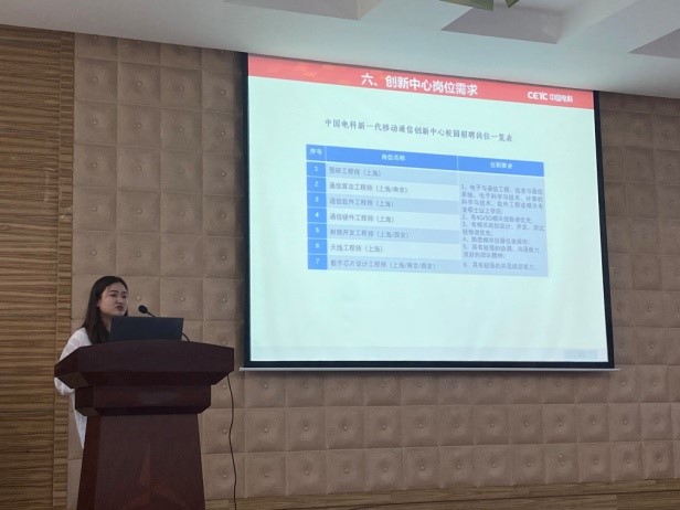 中国电科新一代移动通信创新中心人力资源部马晓卓老师向同学们介绍了中国电科新一代移动通信创新中心的招聘信息、薪资待遇、岗位需求、人才发展策略等,欢迎同学们积极投递,加入中国电科新一代移动通信创新中心大家庭。