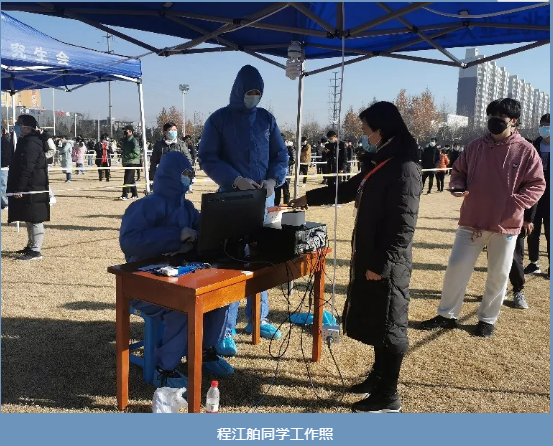 紧张地不敢让手机黑屏,生怕错过群里的每一条信息;一秒数十条的肯定,那是屏幕后坚定的决心。那一天,山气氤氲,朝阳初升,冬至的早晨还是那样朦胧,但是在云天苑操场上却有那样一群人在忙碌着。我很荣幸能加入到他们的队伍中去。刚开始确实有紧张不安,引导队伍、检录试管……但是在熟练操作之后尚可得心应手。可忙忙碌碌之中,连时间似乎也放慢了脚步,融入在数十个身着深蓝隔离服的人群之中守护别人,那是一种幸福。长安常安,西安加油!