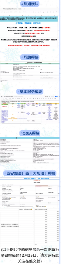 本在线表格由点点taptap信愿志愿者服务队于12月23日晚创建,灵感来自河南、山西暴雨的“救命文档”以及其他兄弟院校的疫情互助文档。本表希望为西工大师生提供疫情期间的及时准确的信息。表格主要由“互助、基本服务情况、Q&A、西安加油!西工大加油” 四个模块组成。其中部分前期内容由点点taptap信愿志愿者服务队实地走访收集整理而得。