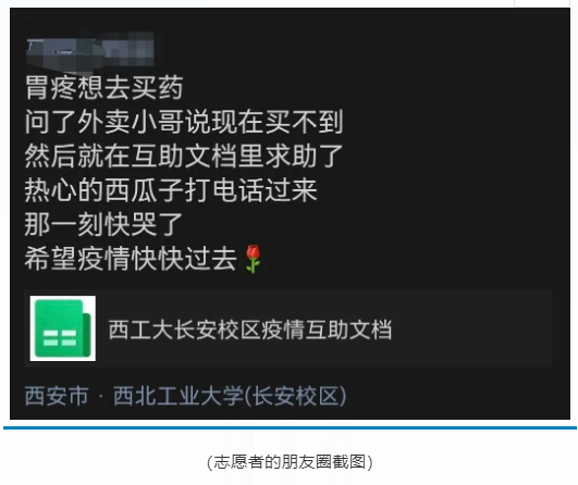 我们的志愿者也有自己的感想:疫情当前,作为一名普普通通的老员工,能发挥作用真的很开心,哪怕是一点点。上午计划敲定,中午分头行动。大家的目标一致,效率真的没的说。队长的负责,队员的认真,工作人员的配合,同学们的乐观,最终铸成本次活动的顺利进行。听闻老师同学们的问题一个个被解决,看着一条条加油话语不断的刷新增加,让我真正意识到志愿活动的意义,意识到志愿队的意义。西安青年在行动!