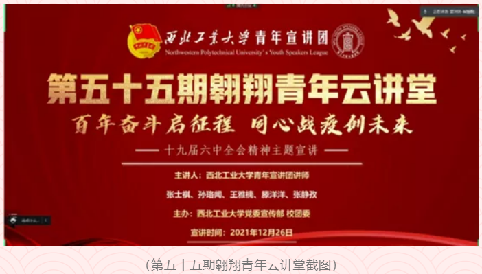 2021年12月26日,公司团委组织全院团学青年线上参加第五十五期翱翔青年云讲堂,聆听青年宣讲团十九届六中全会主题宣讲。通过此次宣讲,同学们对十九届六中全会精神有了更加细致全面的了解。
