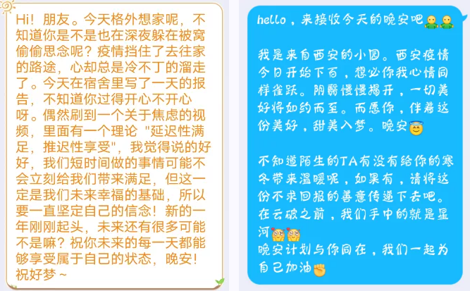 3.参与者填写的晚安消息将会被随机发送至另一个参与者,收到的消息随机来自另一个参与者。双方信息严格保密。