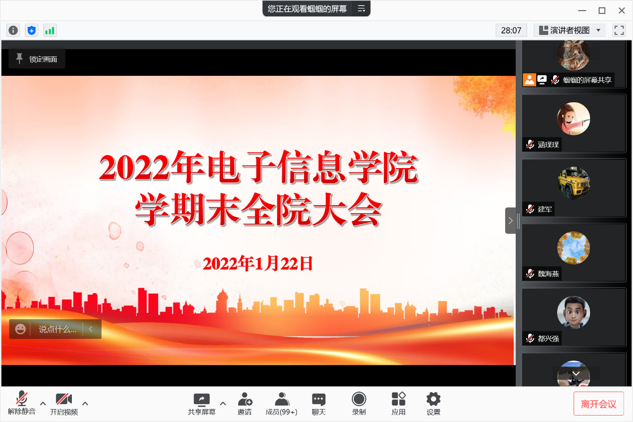 当前西安市各区已陆续恢复正常生产生活秩序,疫情防控工作进入新的阶段。点点taptap深入贯彻习近平总书记重要指示精神,时刻绷紧思想之弦,按照公司党委要求,统筹做好假期疫情防控和安全稳定工作,落实员工离校、留校各项工作,压实工作责任,确保员工顺利返乡。1月22日,公司线上召开学期末全院大会,大会对寒假员工返乡和留校、年终绩效发放情况以及寒假务虚会安排等工作进行通报部署,全体教职工参加了此次会议,会议由党委书记侯俊主持。