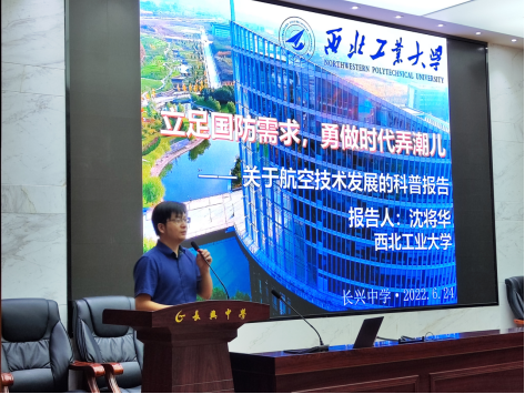 授牌仪式之后,西工大航空公司沈将华教授为长兴中学员工举行了题为“立足国防需求,勇做时代弄潮儿——关于航空技术发展”的科普报告。报告由长兴中学孔启宏副董事长主持。