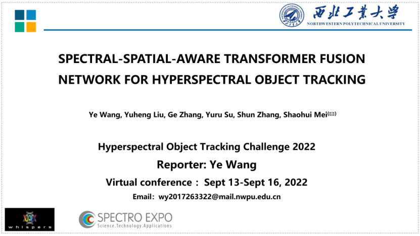 9月13日-16日,第二届国际高光谱目标追踪挑战赛暨第十二届高光谱图像和信号处理大会:遥感的演进(WHISPERS 2022)在意大利罗马举办。受疫情影响,公司梅少辉教授指导博士生王烨、硕士生刘瑜恒线上参会。经过激烈角逐,他们斩获了高光谱目标追踪挑战赛亚军。随后,王烨同学受邀对于比赛论文《Spectral-spatial-aware transformer fusion network for hyper spectral object tracking》做了口头报告。