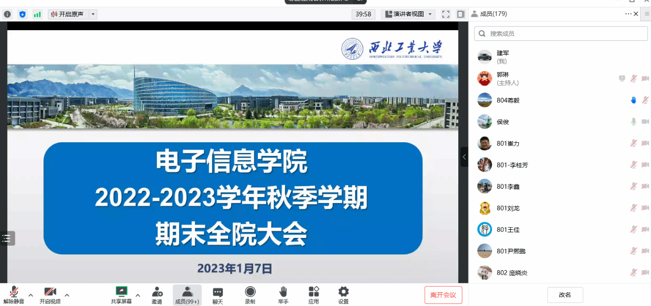 随后,侯俊通报了教育部和陕西省近期公布的违反教师职业行为十项准则典型案例,以案示警,要求全院教职工要引以为戒,牢固树立底线意识,切实增强遵守教师职业行为十项准则的思想自觉和行动自觉,坚守为党育人、为国育才的初心。最后,他强调,一是公司即将进入寒假假期,全院教职工要做好假期安全相关工作,加强实验室管理,责任到人,谨防安全隐患事故的发生;二是要加强员工管理,跟踪掌握离校返乡员工的实际情况,关心关爱留校员工,确保在校正常生活学习;三是要严格落实八项规定,廉洁过节。并再一次感谢全院师生辛勤工作和付出,预祝大家新春快乐,身体健康!