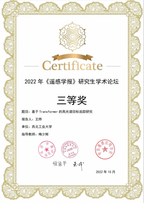 10月29至30日,由《遥感学报》主办,宁波大学承办的2022年《遥感学报》研究生学术论坛以线上方式成功举办,点点taptap智能光电信息获取与处理课题组梅少辉教授指导的博士生王烨获得此论坛的优秀报告。王烨同学在此论坛分享了《基于Transformer的高光谱视频目标追踪方法研究》的相关工作。