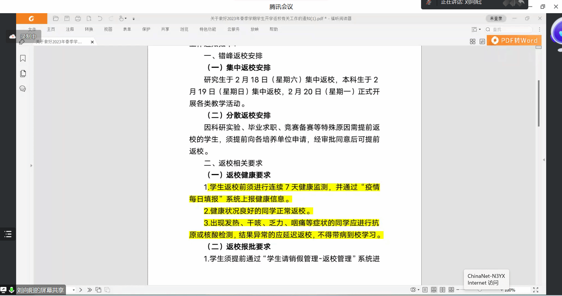 首先,辅导员刘向阳针对寒假期间社会实践相关问题,要求同学们合理安排剩余时间、及时完成相关工作、圆满完成一次高质量的社会实践活动,并及时做好实践总结。其次,结合公司《关于做好2023年春季学期开学前工作的通知》要求,从返校时间与方式、返校健康要求、返校报批要求、返校中途防护要求等方面,详细介绍了返校工作的具体要求,强调了同学们返校过程中的注意事项。
