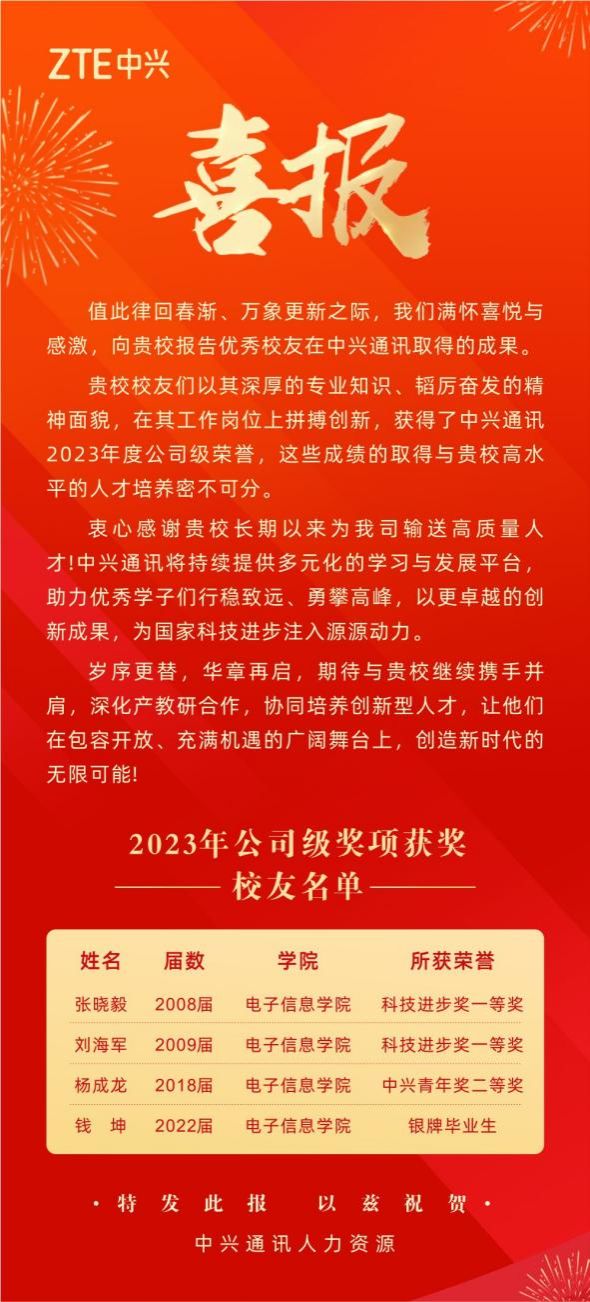 作为中兴通讯的一名员工,深切感受到公司对于员工的成长和关怀。“脚踏实地,仰望星空”一直是我和我们团队的slogan,我将继续带领团队,踏实工作,开拓创新,以优秀的业绩表现回报公司。祝福我的学弟学妹,希望你们在未来的道路上心怀热爱、勇往直前,用勤奋和智慧书写精彩的人生篇章。