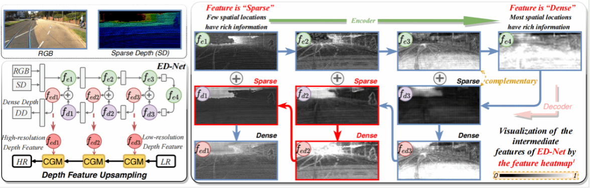 成果六:实验室博士生王宇飞为第一作者与博士生王绍谦等人共同完成的“Improving Depth Completion via Depth Feature Upsampling”,该工作针对编解码网络特征从“稠密到稀疏到稠密”过程中的信息缺失问题,提出了一种深度特征上采样算法,可以显著提高现有基于编码器-解码器方法的性能,并获得了最优的深度填充性能。该项成果发表于CVPR 2024。