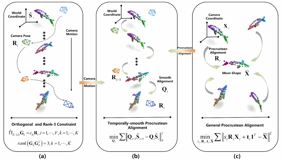 成果五:实验室二年级硕士生石家玮为第一作者与博士生邓辉等人共同完成的“Non-rigid Structure-from-Motion: Temporally-smooth Procrustean Alignment and Spatially-variant Deformation Modeling”,该工作聚焦非刚性结构与运动恢复中的旋转模糊以及剧烈形变建模问题,提出了一种基于时序对齐与空间重构的解决方案。多个公开数据集以及多种形变类型数据上的对比测试验证了论文提出方法的有效性。该项成果发表于CVPR 2024。
