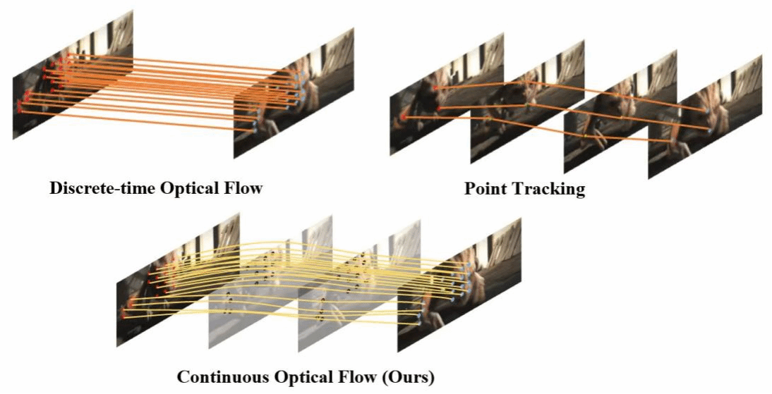 成果二:实验室二年级硕士生罗健勤、博士生万哲雄为共同第一作者等人完成的“Continuous Parametric Optical Flow”,该工作聚焦于单目视频的像素级连续运动估计,提出了一种基于连续光流的融合优化方法来描述真实动态场景的稠密运动轨迹。实验表明提出方法在基于多帧图像输入的像素级连续运动估计任务上达到当时领先水平,在真实场景表现卓越。该项成果发表于NeurIPS 2023。