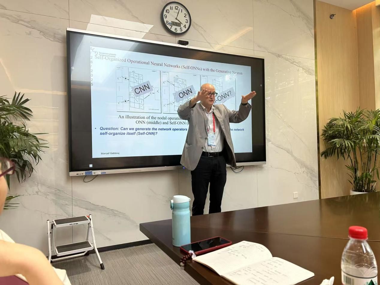 报告中,Gabbouj教授针对深度学习在图像处理领域的核心瓶颈展开深度剖析。他指出,尽管深度学习在众多科学领域突破传统方法局限,但高计算成本与 "黑箱" 特性制约了其可持续发展。为此,他带领团队提出以 "绿色学习" 为目标的创新解决方案 —— 运算神经网络(Operational Neural Networks, ONNs),通过重新设计神经元模型,在保持高性能的同时显著降低计算负荷。报告结束后的互动环节,现场气氛尤为热烈。师生们围绕运算神经网络的实际应用场景、训练过程中的参数优化等问题踊跃提问。